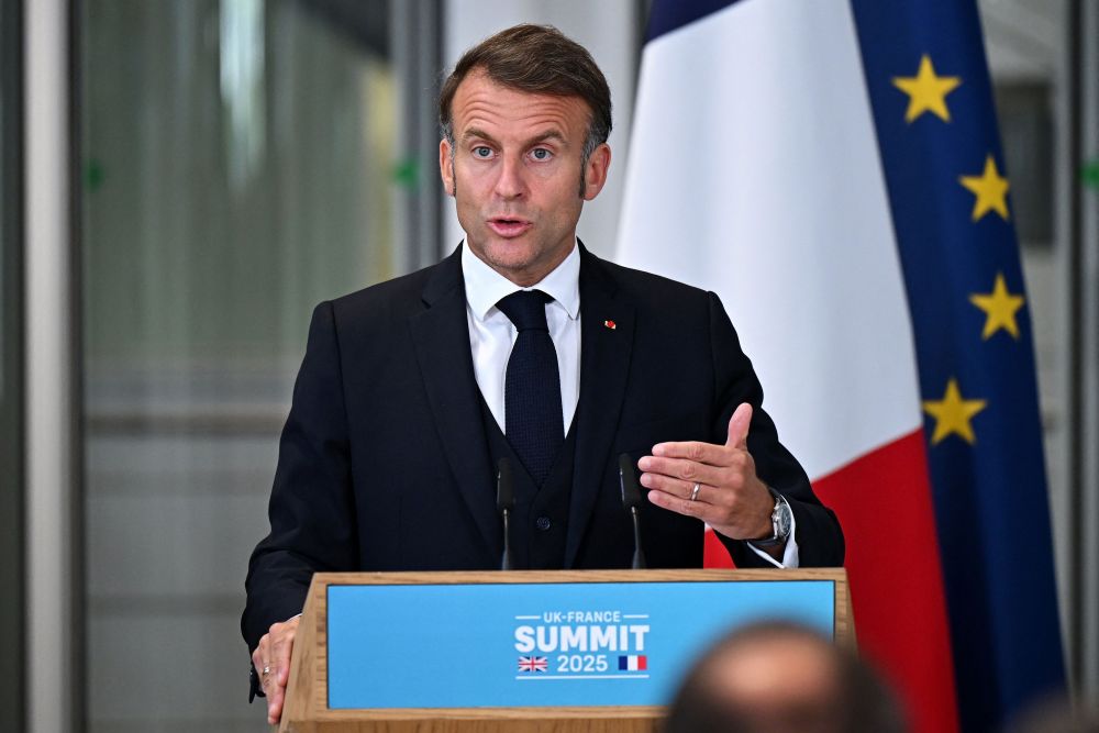 7月10日,法国总统马克龙在英国伦敦郊野诺斯伍德军事基地出席与英国首相斯塔默(不在画面中)举行的纠合记者会。新华社/法新